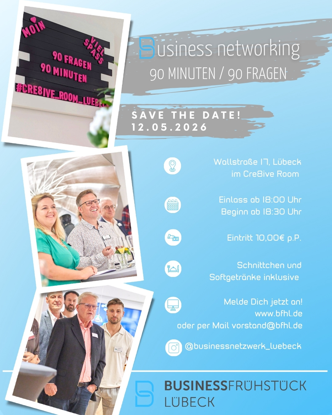 Das Businessfrühstück Lübeck e.V. (BFHL) ist ein Netzwerk von Unternehmern und leitenden Angestellten. Die Mitglieder treffen sich wöchentlich zum Frühstück (dienstags 7.30 – 9.00 Uhr), um Wissen, Information und Empfehlungen auszutauschen. Ergänzt werden diese Treffen durch After Work Meetings in wechselnden Lokalitäten Lübecks, um Kontakte und Gespräche in angenehmer Atmosphäre zu vertiefen.